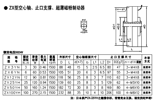 ZX型空心軸止口支撐超薄磁粉制動器型號標(biāo)準(zhǔn)參照日本三菱電機(jī)ZX-YN型產(chǎn)品、ZX-YH型產(chǎn)品。