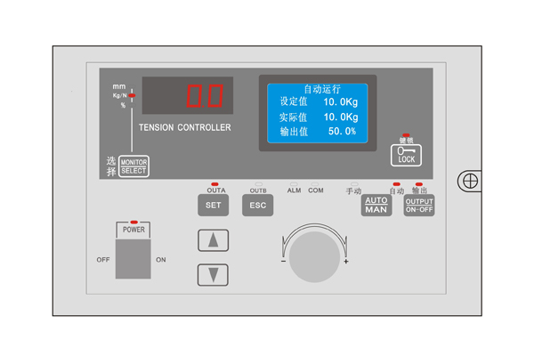 KTC838全自動與卷徑張力控制器采用圖形液晶顯示器,可選擇中、英文顯示,界面友好易用,可輔出CH24V/4A直接驅動磁粉離合器,磁粉制動器,也可以輸出0~5V,0~10V信號,控制變頻器,伺服電機或其它執(zhí)行機構,對卷料系統(tǒng)進行高精度的張力控制。KTC838全自動與卷徑張力控制器廣泛應用于造紙、印刷、包裝、紡織印染等行業(yè)。